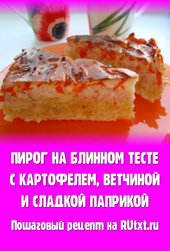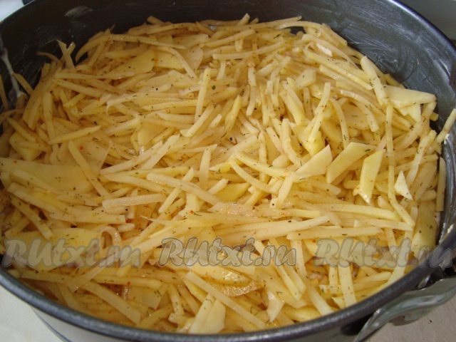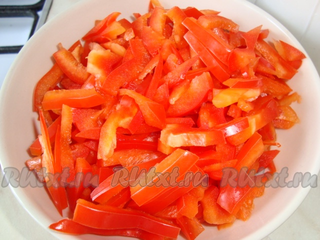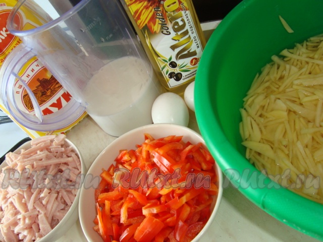 Картофель, перец и ветчину режем тоненькими брусками. Я режу брусками, а не пластинками для того, чтобы тесту легче было проникать в начинку.