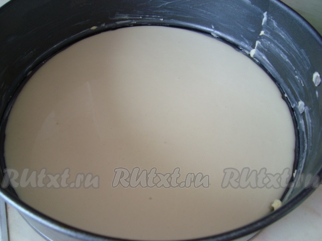 Форму смазываем маслом, выливаем часть теста так, чтобы покрыло дно.