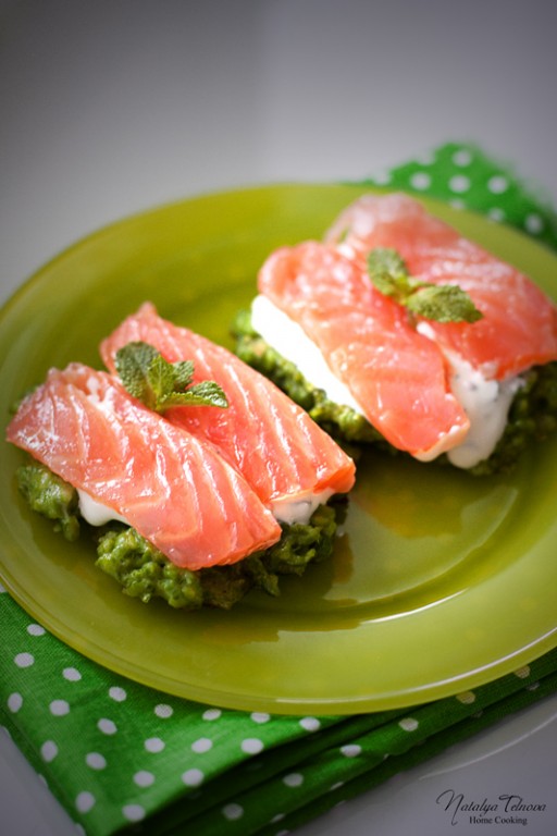 Сегодня в свое меню я добавила ярких красок в виде красной рыбы и зеленых гороховых оладьев. А аромат свежей мяты, ммм...