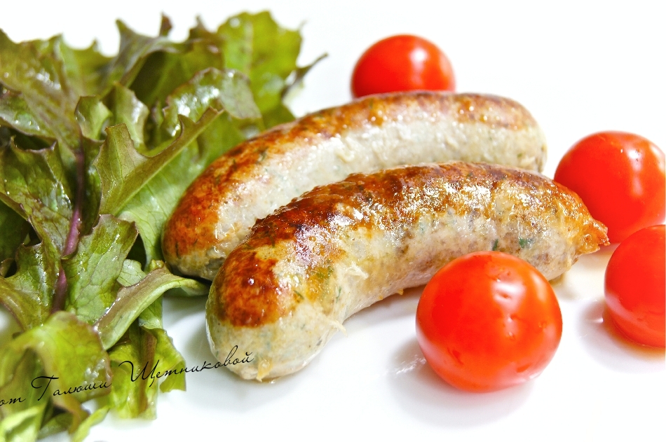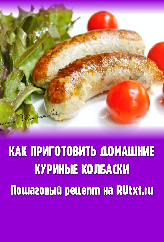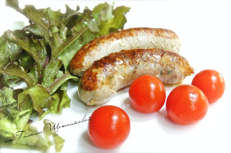 Колбаски обжарила на сковородке с растительным масло. С первой стороны до золотистой корочки, перевернула, убавила огонь, накрыла крышкой и через 15-20 минут вкусные, сочные домашние куриные колбаски готовы.