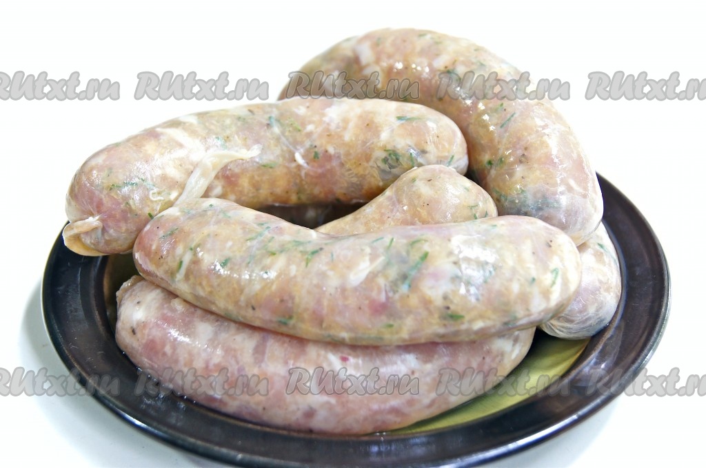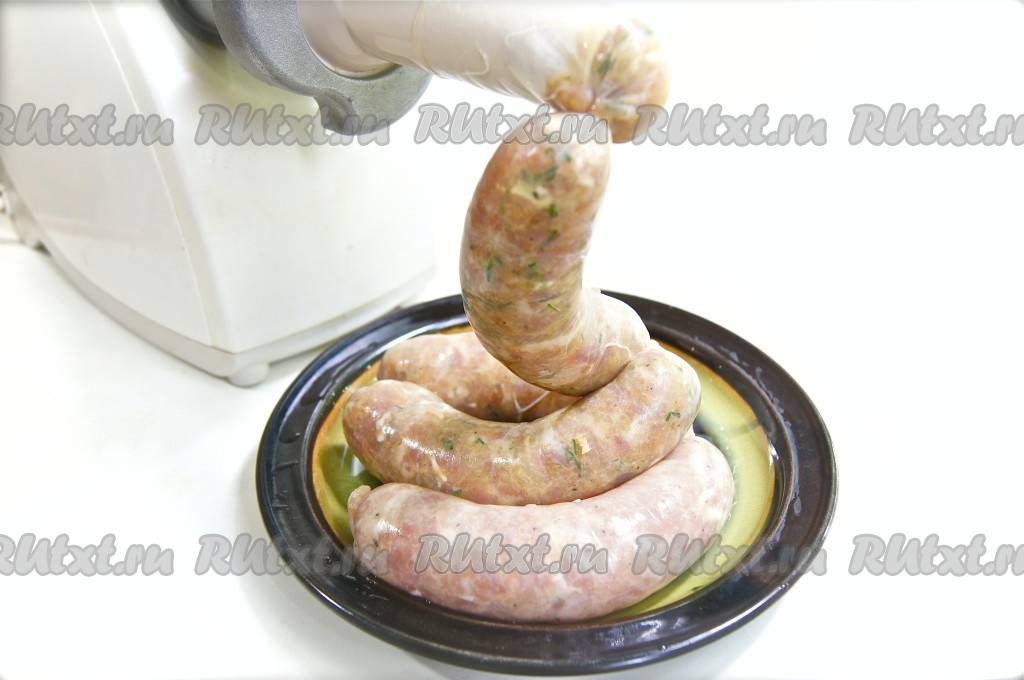 Для набивки использовала мясорубку с насадкой для колбасок. Насадила оболочку на насадку до конца. Фарш плотно утрамбовала в мясорубку и начала делать колбаски, как только фарш появился, перевязала конец оболочки узлом, а можно ниткой. Плотно набила оболочку фаршем, отмерила нужное количество и скрутила оболочку, так у меня получилось несколько домашних куриных колбасок. Постарайтесь оставлять небольшой промежуток между колбасками – так их будет удобнее разделять.