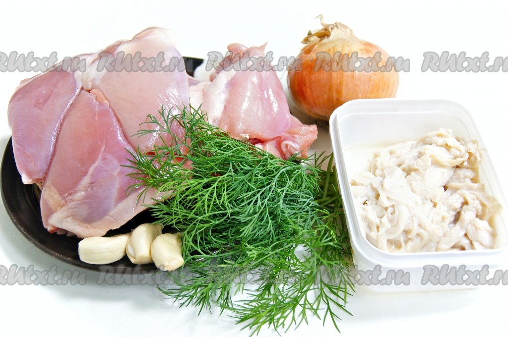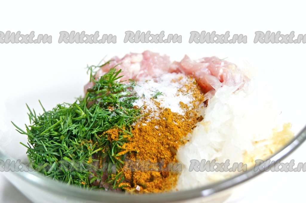 Из куриного филе приготовила фарш, добавила измельченные лук и чеснок, рубленный укроп, приправу для курицы, посолила и поперчила по вкусу. Тщательно перемешала.