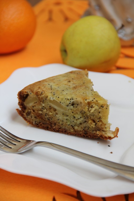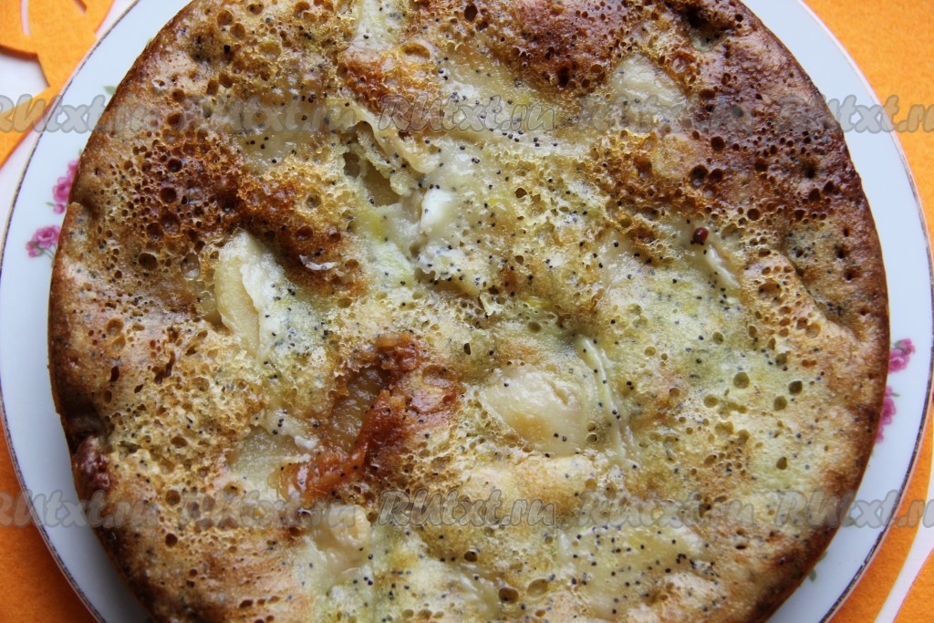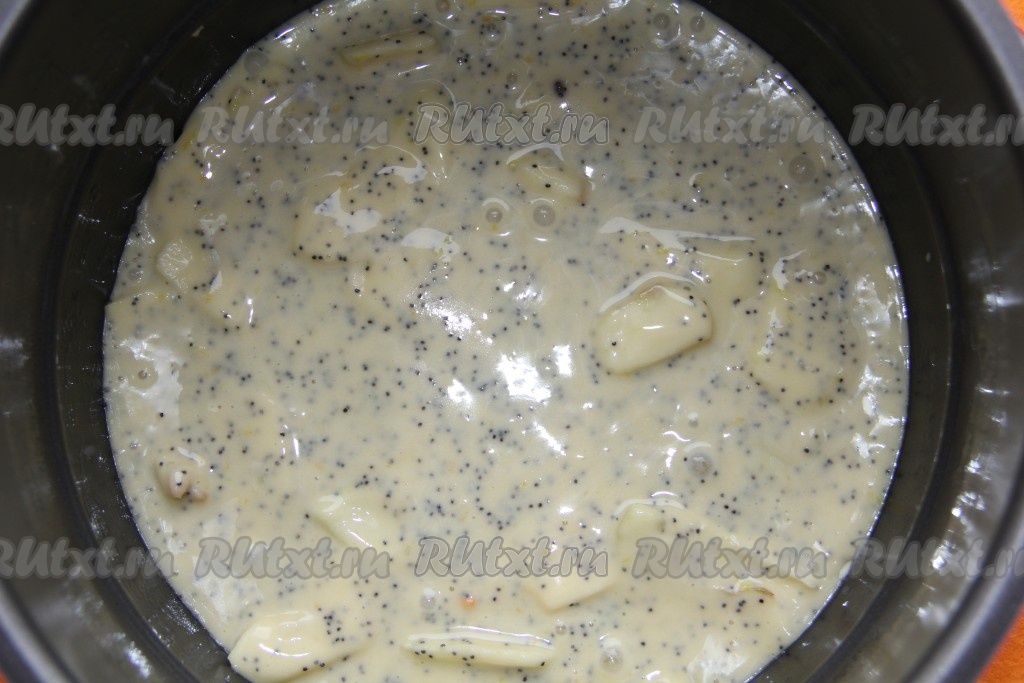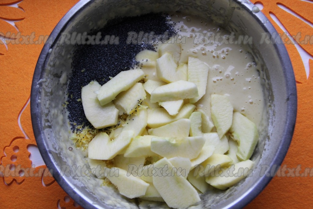 Яблоки очищаем от кожуры и разрезаем на плоские дольки. В тесто кладём дольки яблок, по желанию, можно добавить мак и цедру лимона для аромата.