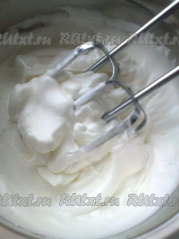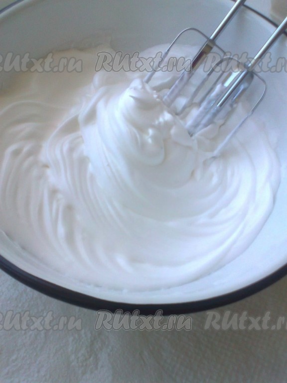 Взбиваем состаренные белки (не бойтесь, они неиспорченные) комнатной температуры (не из холодильника) с щепоткой соли до мягких пиков. Затем постепенно добавляя сахар, взбиваем белки до глянцевого блеска и твердых пиков (всего 7 минут).