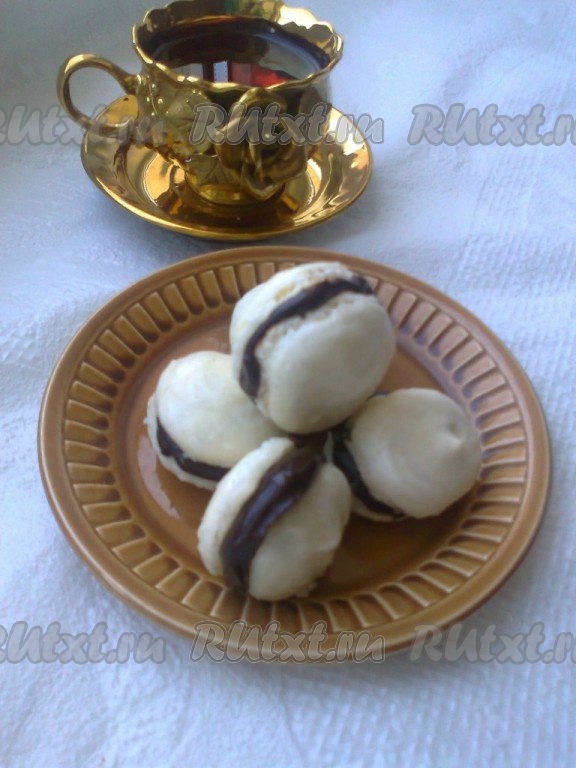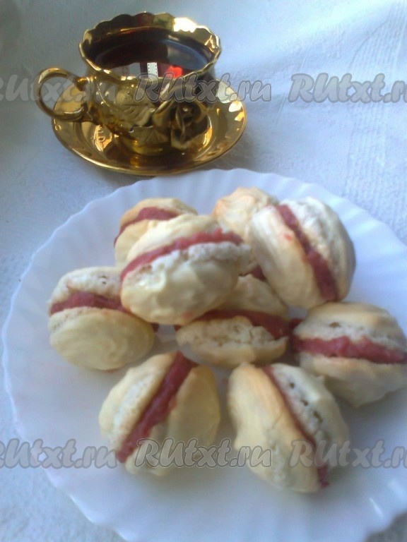 Теперь приготовим макарон (macarons): на центр печенья положим немного ягодной начинки и придавим другим печеньем. Таким образом соединим все половинки.