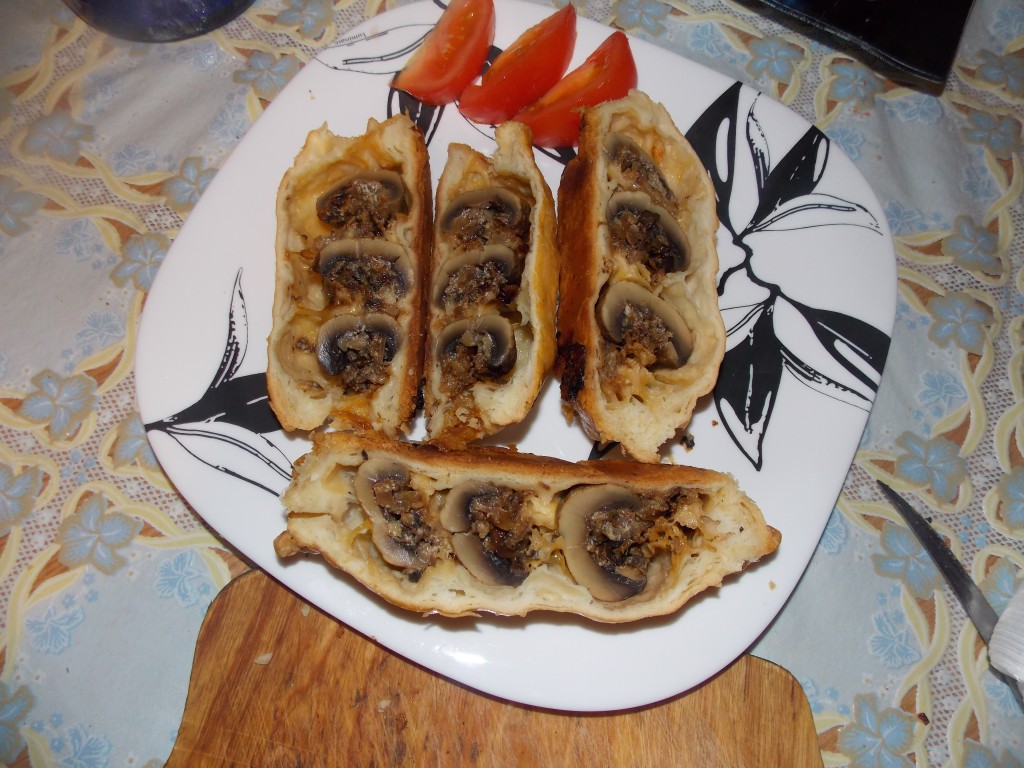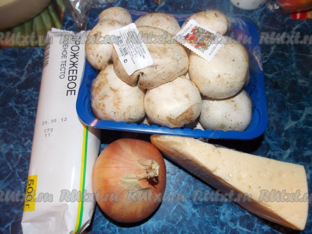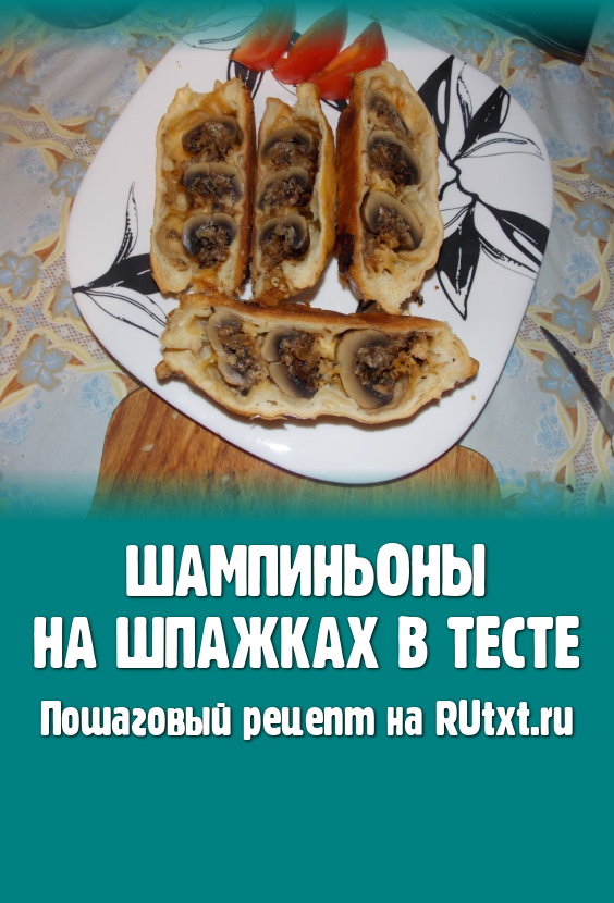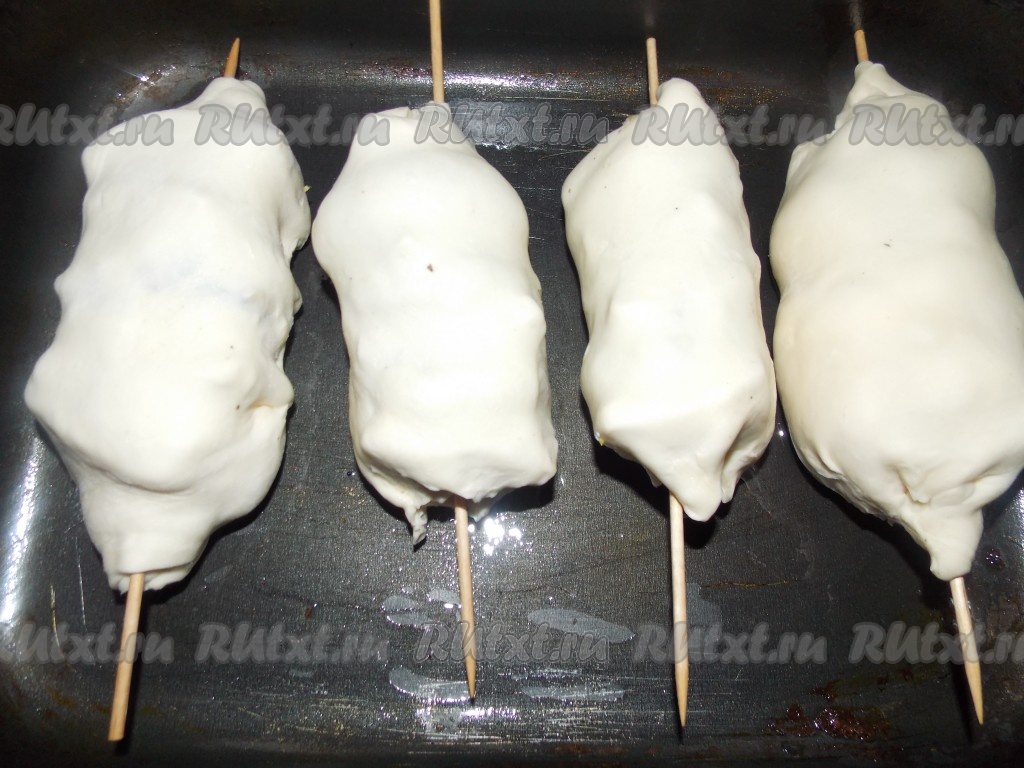 Выкладываем шпажки с шампиньонами на предварительно смазанный противень, затем смазываем тесто сверху яйцом и отправляем в духовку до готовности. У меня готовилось примерно 20-30 минут при температуре 200 градусов.