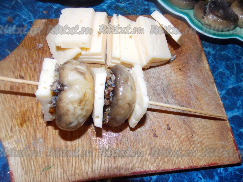 Затем берем шпажки и насаживаем сначала кусочек сыра, затем фаршированный шампиньон, затем опять кусочек сыра и гриб. У меня на шпажке получалось примерно по 3-4 шампиньона и 4-5 кусочков сыра.