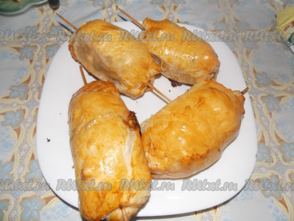 Затем обтягиваем нашу шпажку с грибами заранее размороженным тестом.
