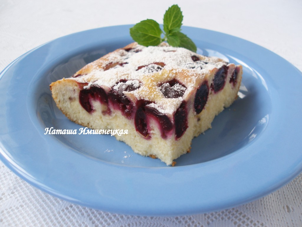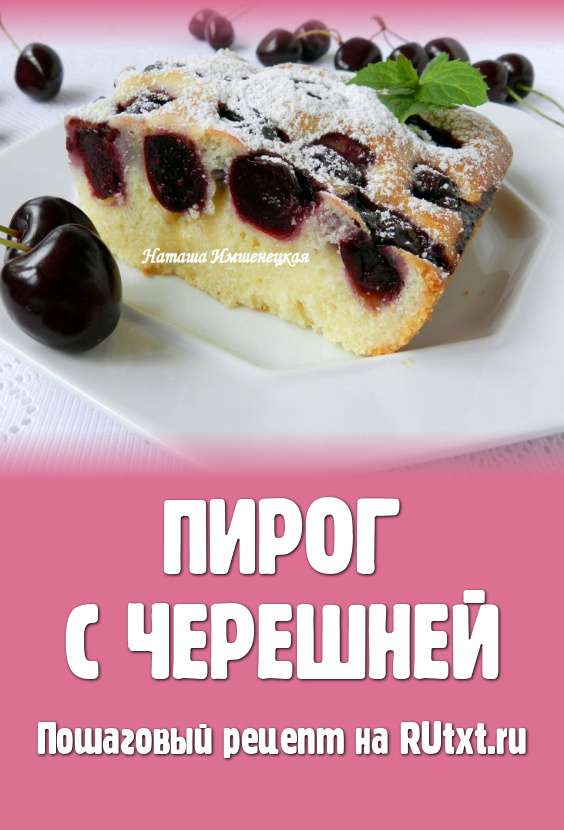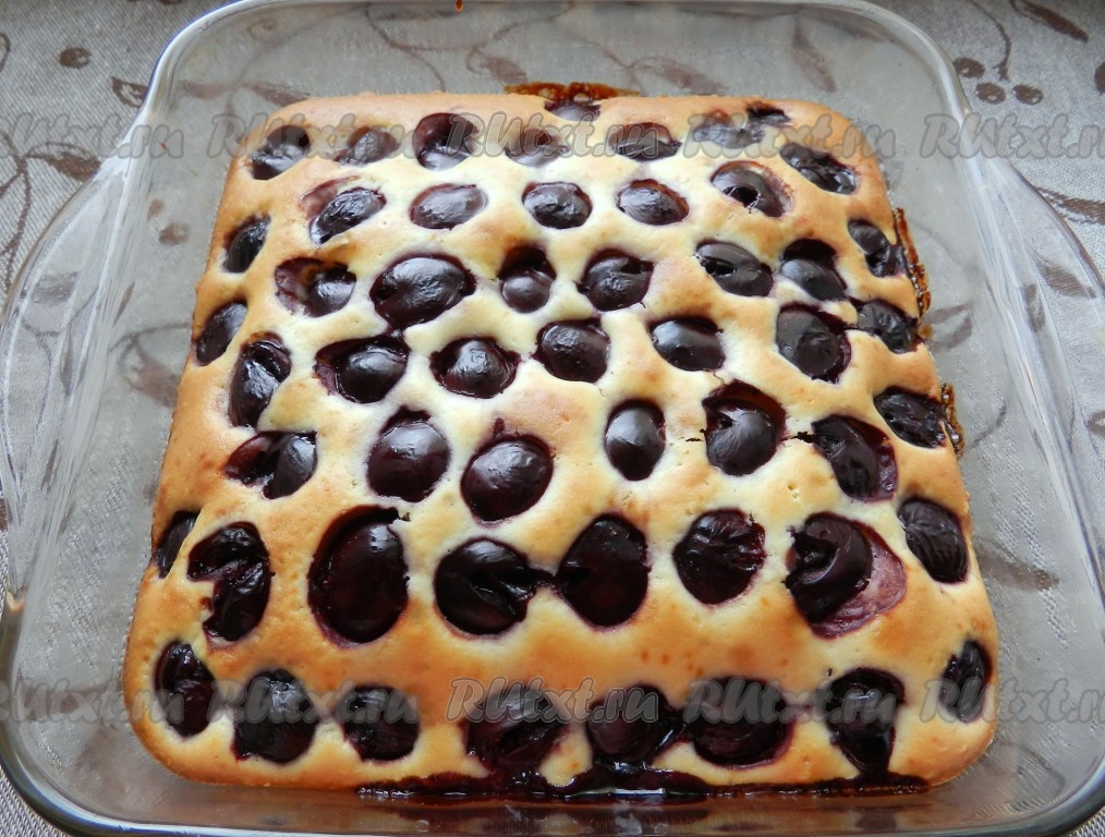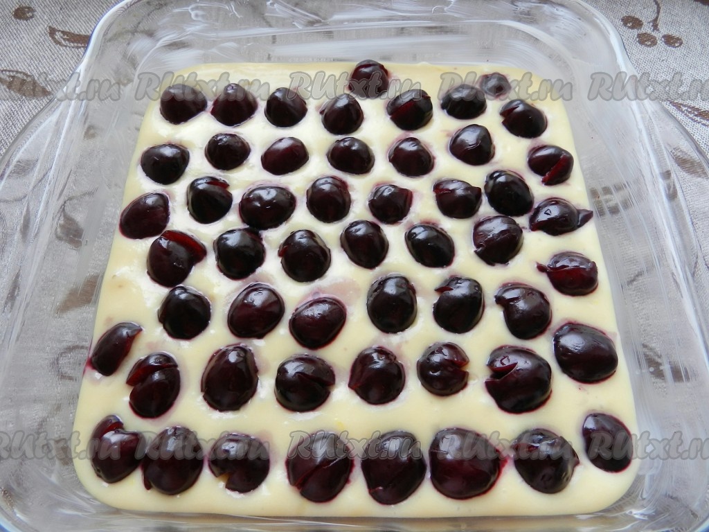 Черешню очистить от косточек и выложить на тесто, немного вдавливая ягоды. Выпекать пирог с черешней в разогретой до 180 градусов духовке 30-35 минут, готовность проверять сухой деревянной шпажкой.