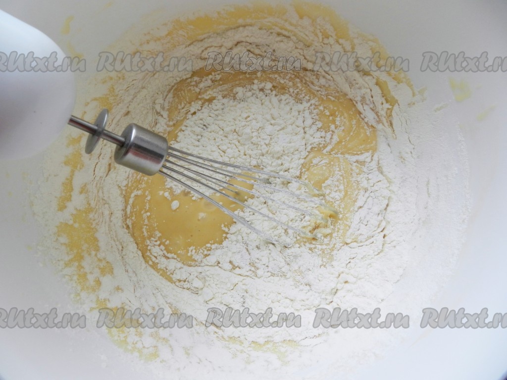 Постепенно всыпать муку с разрыхлителем и замесить густое тесто.