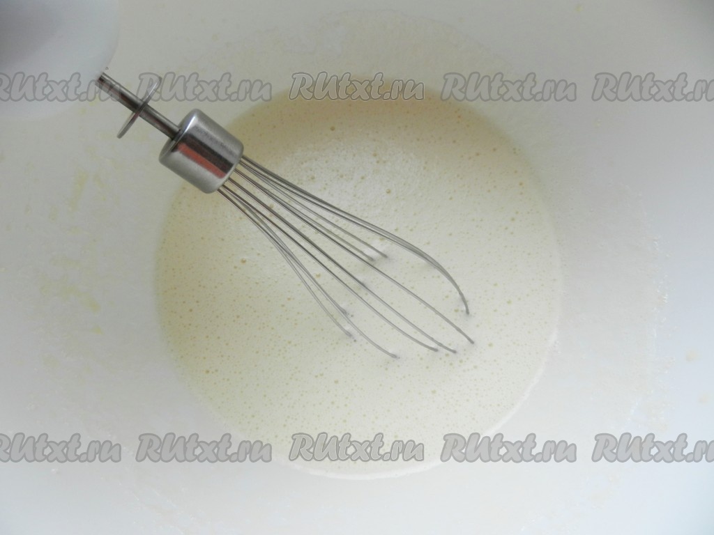 Яйца взбить с сахаром и щепоткой соли. Влить молоко, масло, перемешать до однородности. Добавить лимонную цедру.