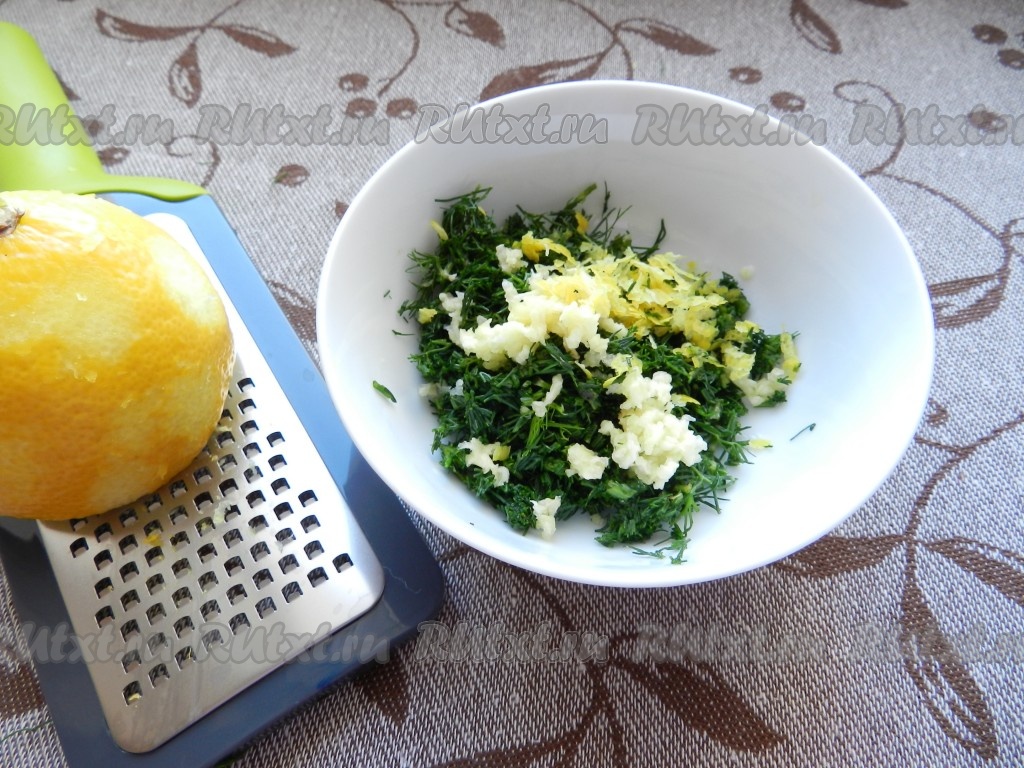 Приготовить соус. Для этого укроп вымыть, обсушить и мелко нарезать. Чеснок пропустить через пресс. С лимона снять цедру и выдавить сок. Все перемешать, посолить и поперчить, влить растительное масло, хорошо растереть все вместе.