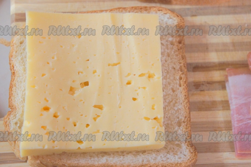 На два куска тостового хлеба выкладываем по кусочку сыра.