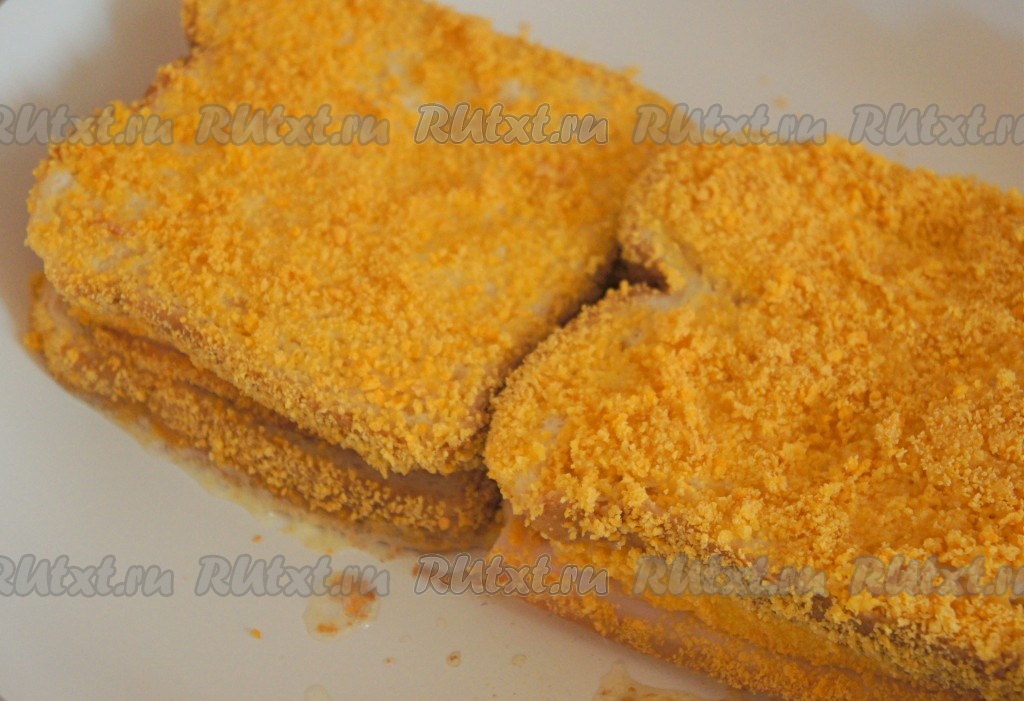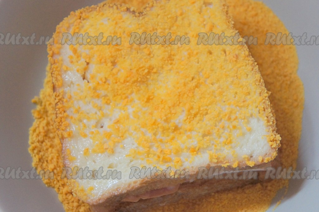 А затем обваливаем бутерброды в панировочных сухарях (по желанию, можно и не использовать панировочные сухари совсем). Для получения на них более плотной корочки процедуру можно повторить 2-3 раза.