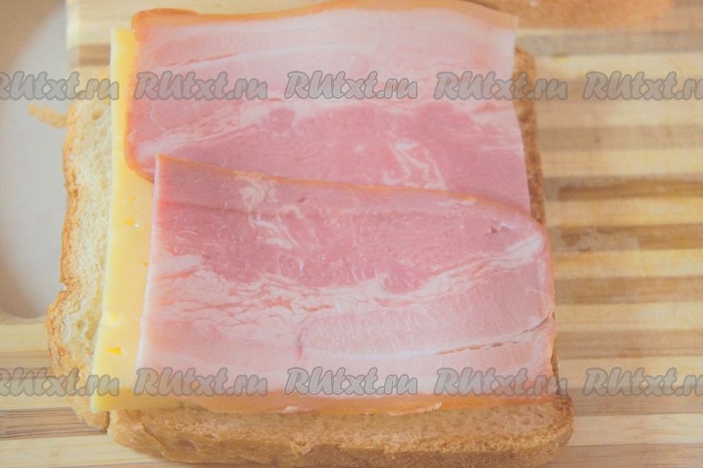 Добавляем грудинку и накрываем каждый бутерброд кусочком хлеба сверху.