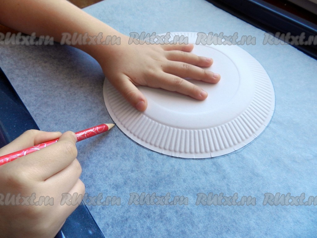 Противень застелить бумагой для выпечки, нарисовать на ней окружность (я использовала тарелку диаметром 18 см). Затем перевернуть бумагу на другую сторону.