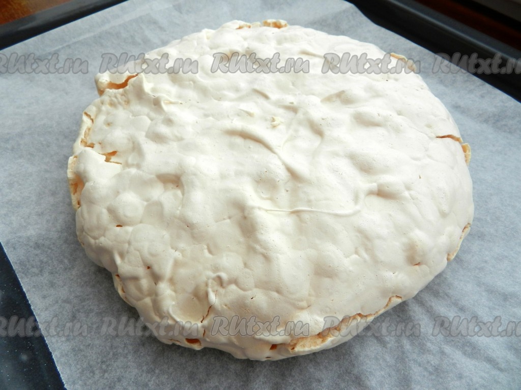 Духовку разогреть до 100 градусов. Выпекать безе 1 час, а затем на 1 час оставить в выключенной закрытой духовке. Корж должен получиться сверху хрустящим, даже хрупким, а внутри - нежным и мягким. Затем достать корж из духовки, оставить до полного остывания.