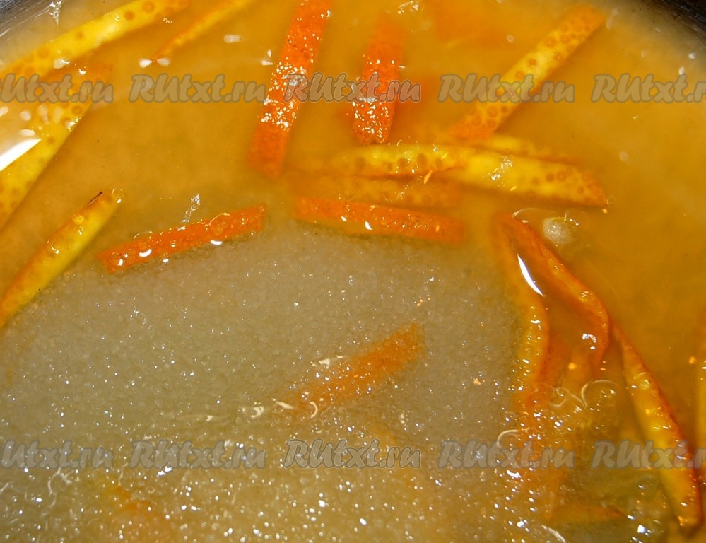 От апельсиновой кожуры срезать тонкий слой цедры (без белого слоя) и нарезать цедру тонкими полосками.