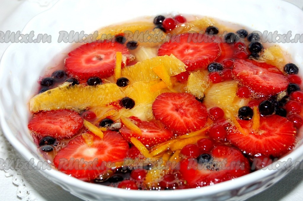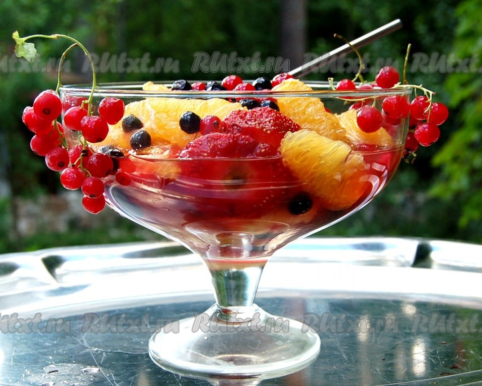 Затем фрукты переложить в вазочку, в которой они будут подаваться. Украсить по своему вкусу и подавать на стол.