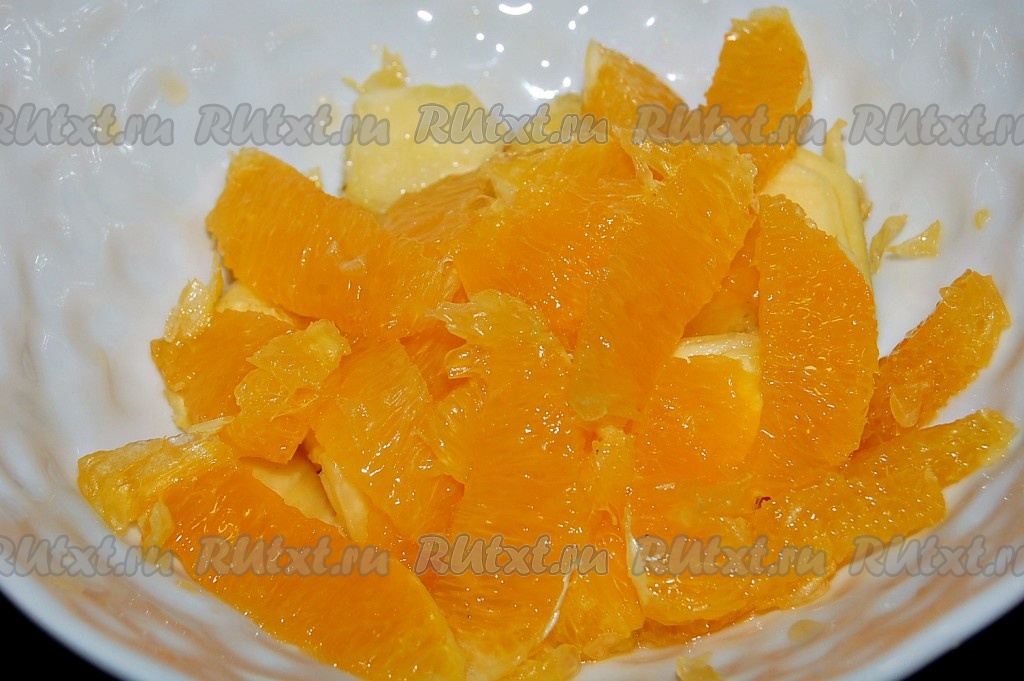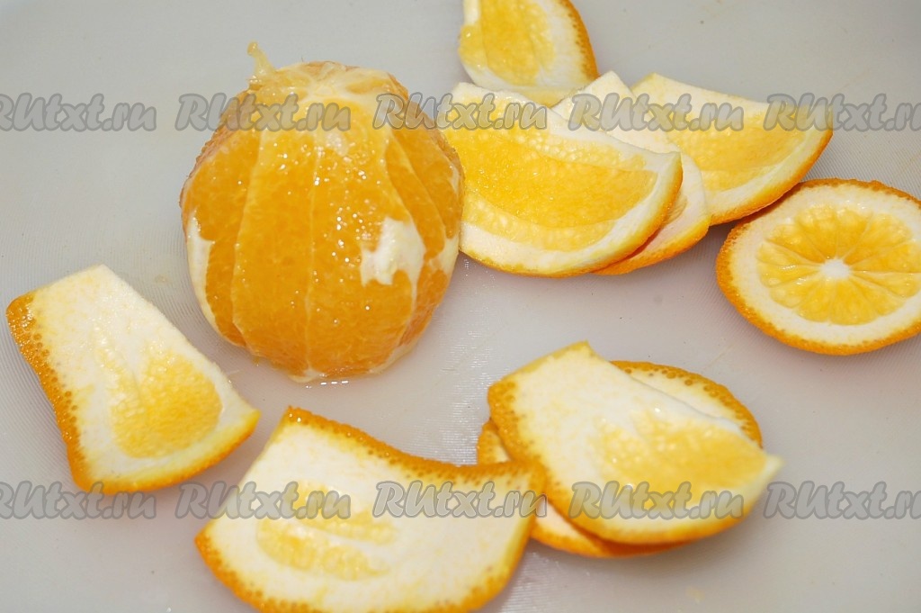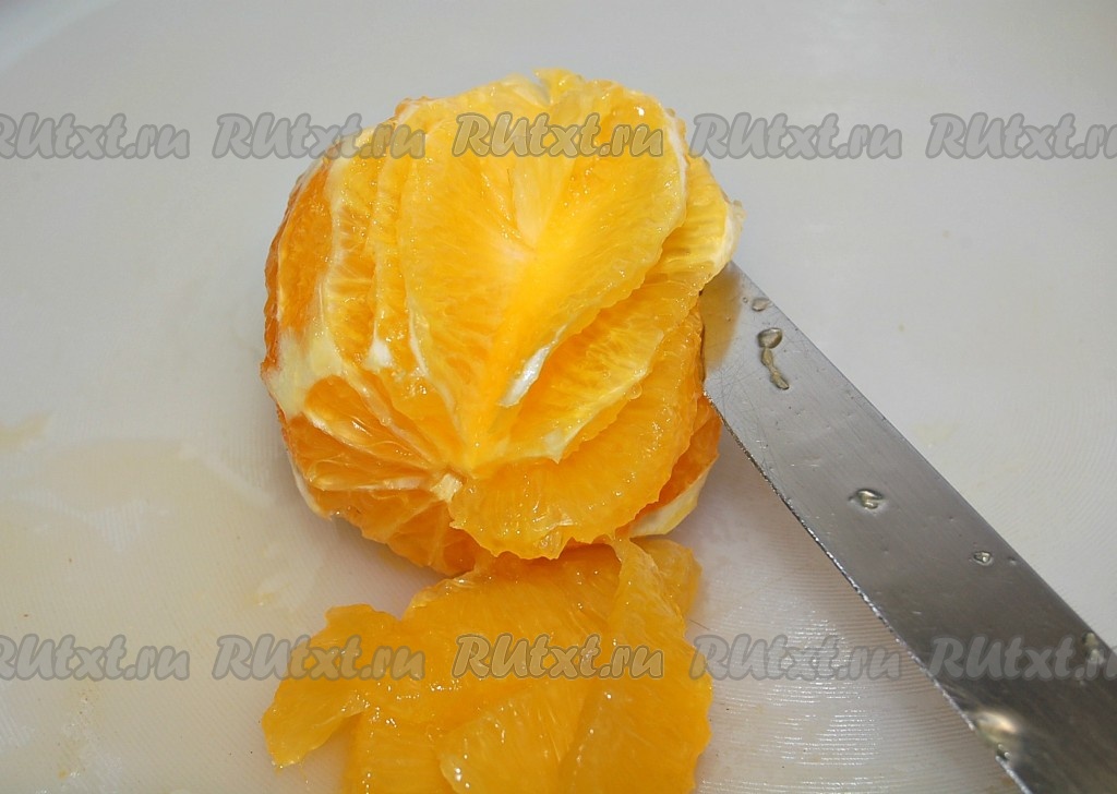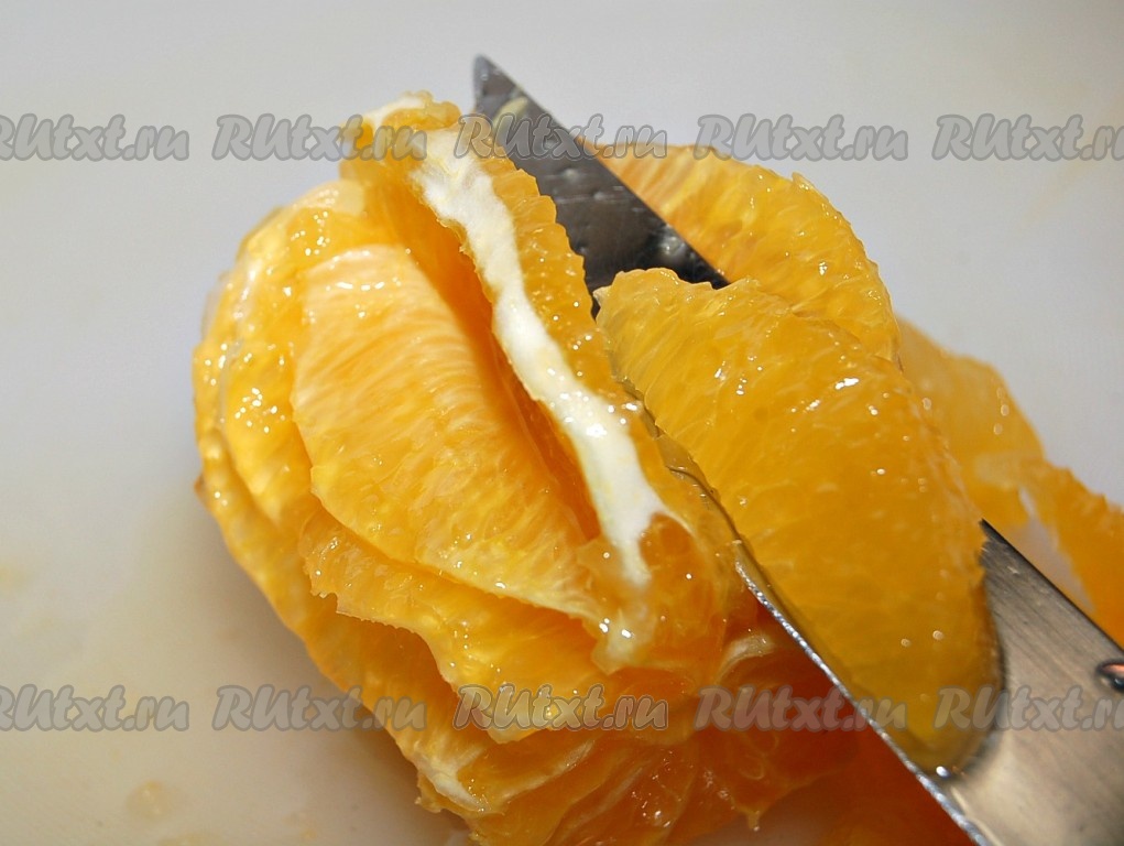 Затем заняться апельсинами. Нужно толсто снять с них кожуру с помощью ножа. Стараться, чтобы не осталось белого слоя.