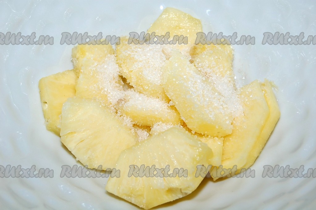 Нарезанные ананасы посыпать сахаром (1 чайная ложка).