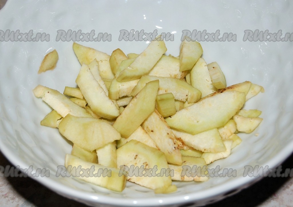 Баклажаны очистить от кожицы, нарезать и отправить в кастрюлю.