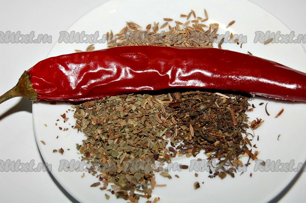 Добавить острый перец целиком (потом выкинуть), сушеный базилик, чабрец и зиру. Посолить, поперчить.