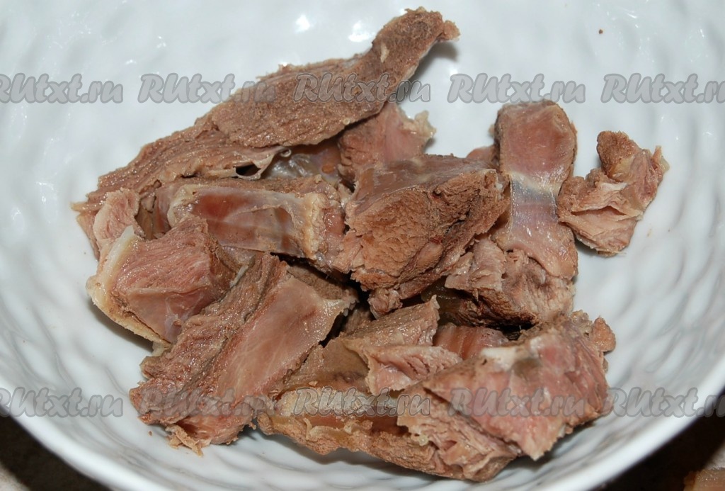 Через 2 часа вытащить баранину из кастрюли, нарезать мякоть небольшими кусочками, кости выкинуть. Мясо отправить обратно в кастрюлю.