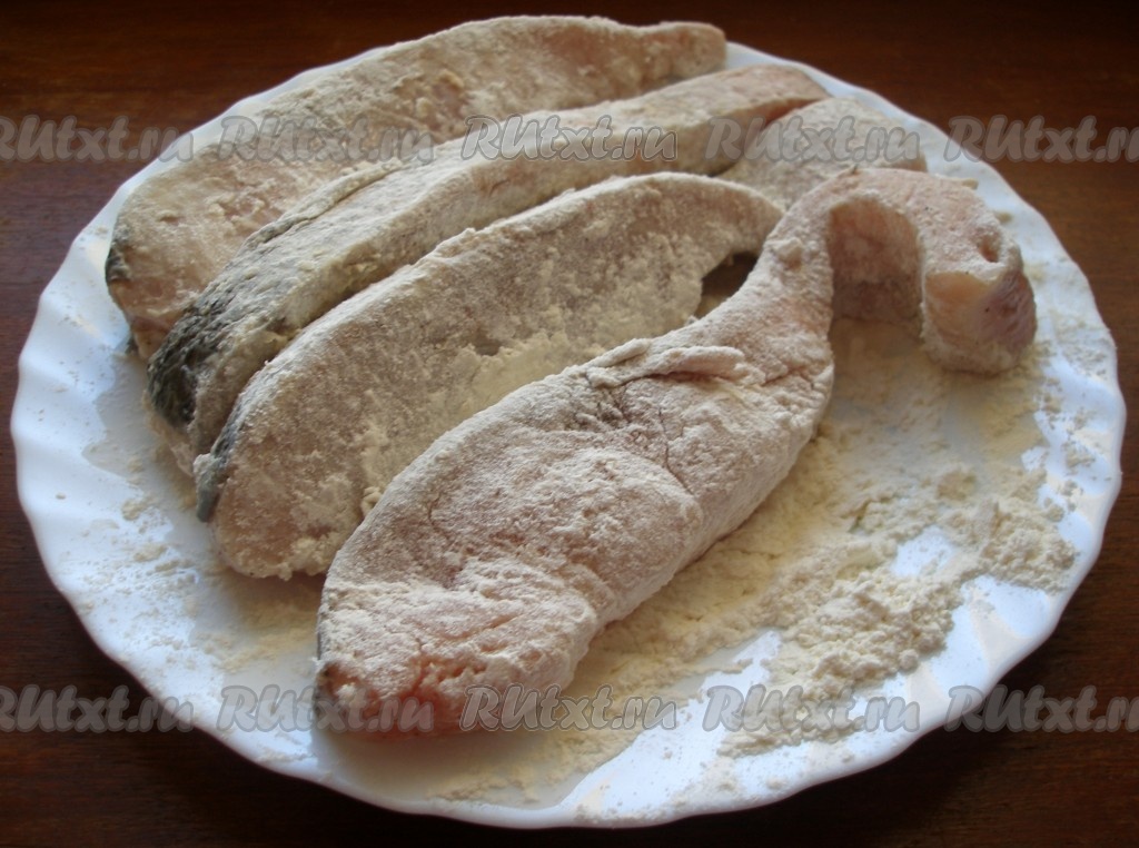 Муку высыпать в тарелку и запанировать каждый кусочек толстолобика в муке.
