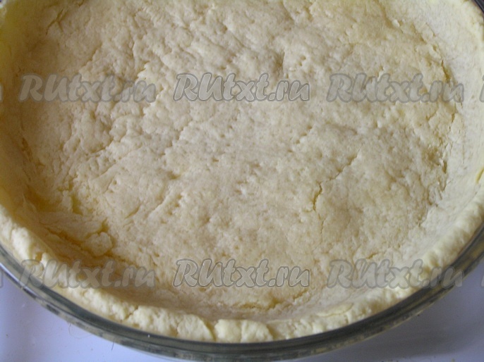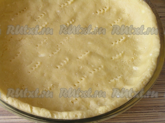 Форму для выпечки (у меня форма диаметром 26 см) смазать растительным маслом, выложить песочное тесто и руками распределить по форме, сделав бортики. Проткнуть тесто вилкой в нескольких местах.