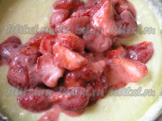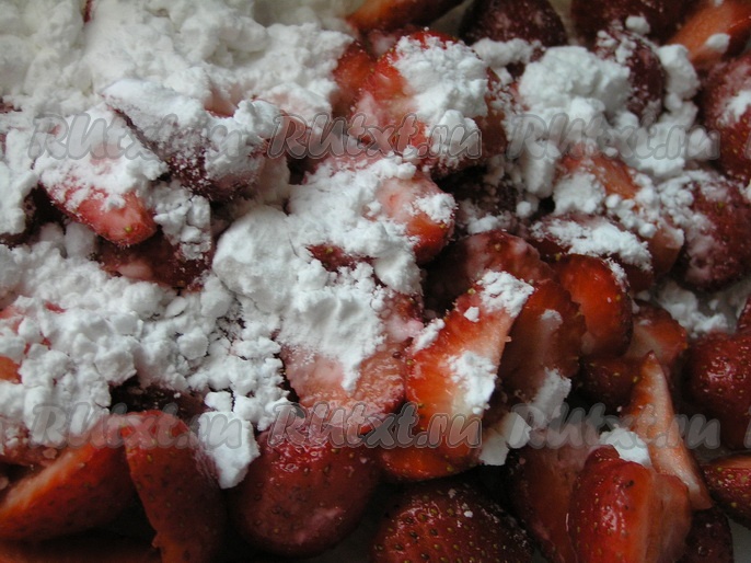 Ягоды клубники нарезать на несколько частей, засыпать крахмалом, перемешать. Вместо клубники можно взять другие ягоды, к примеру, вишню, черешню, смородину и т.д. Если ягоды с кислинкой, то можно увеличить количество сахара в начинке. Если у вас замороженные ягоды, то их следует заранее разморозить и удалить воду.