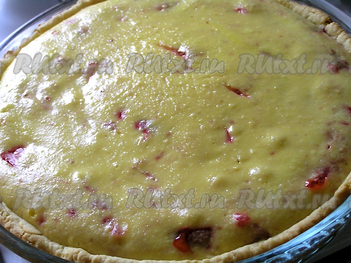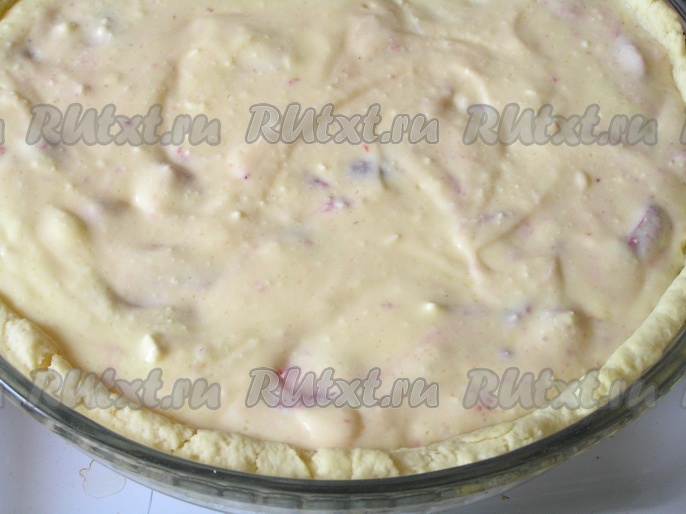 Основу пирога залить творожно-сметанной заливкой с ягодами, разровнять.
