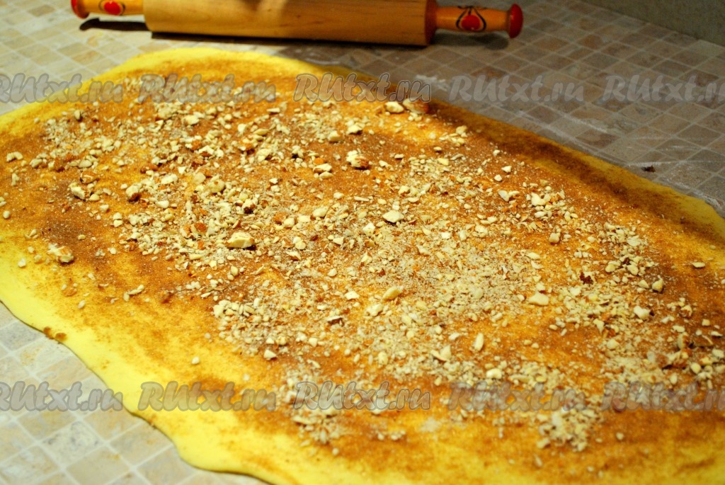 Для начинки растереть масло комнатной температуры с корицей, сахаром, отставить в сторону. Как только тесто подошло, раскатать его на присыпанной мукой поверхности как можно тоньше в прямоугольник, распределить начинку и орехи, оставляя по 1 см со всех сторон, закатать тесто в рулет.