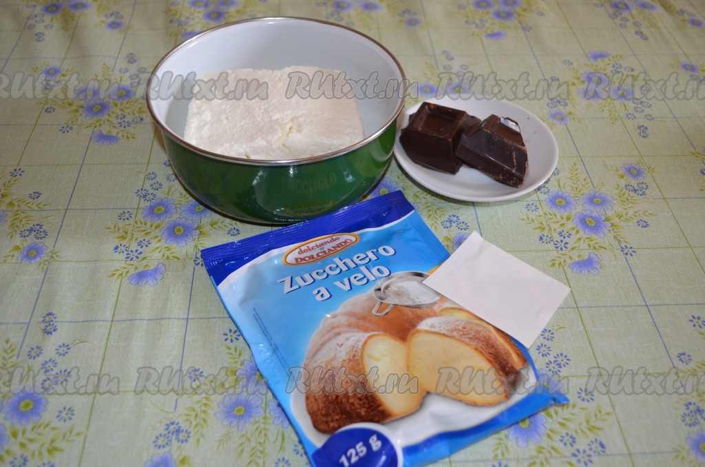 Рикотту растираем с сахарной пудрой. Она должна быть кремообразной и без комочков. Если у вас не так, то предварительно перетираем ее через сито. Затем добавляем капельки шоколада (за неимением, мне пришлось добавить тертый шоколад, но так делать не рекомендуется, т.к. рикотта теряет цвет и не чувствуется хруст шоколада в канноли).