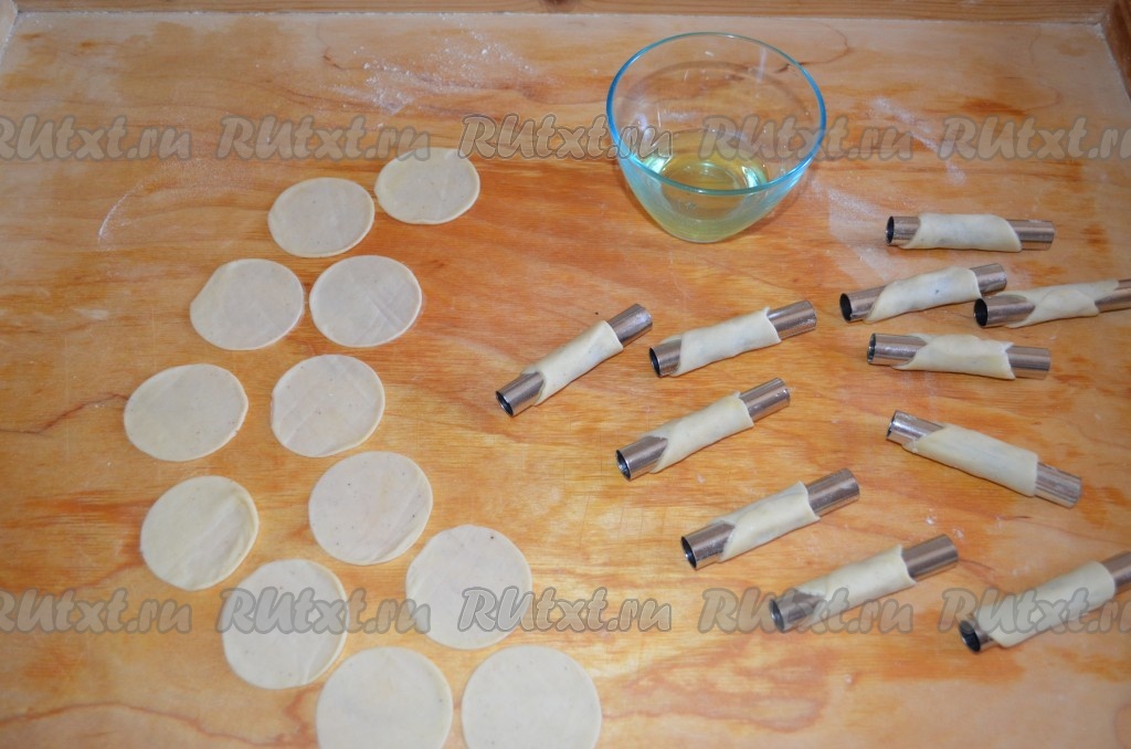 Закручиваем тесто на трубочки и склеиваем концы яичным белком, чтобы при жарке они не разошлось.