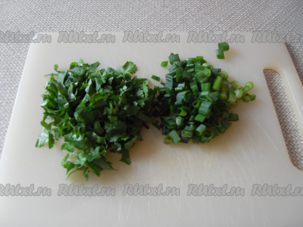 Добавить мелко порезанные лук и кориандр – перемешать.