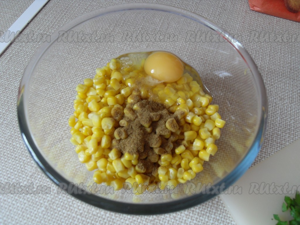 Добавить в кукурузу яйцо, кумин, соль – перемешать.