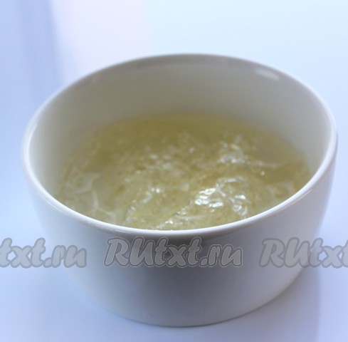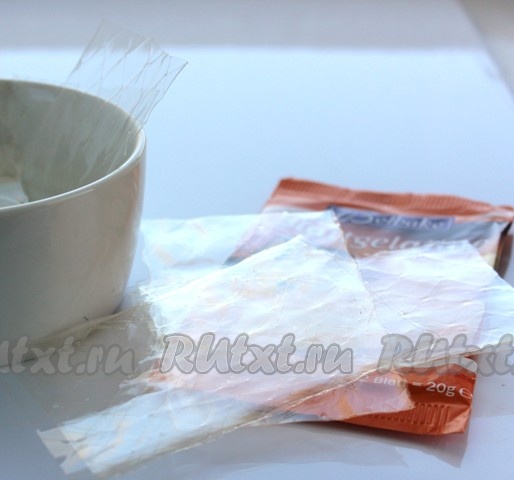 Листы желатина замочить холодной водой. Можно использовать обычный желатин (обычный желатин надо залить водой в соответствии с инструкцией на упаковке, дать набухнуть, а потом прогреть на небольшом огне до полного растворения желатина).