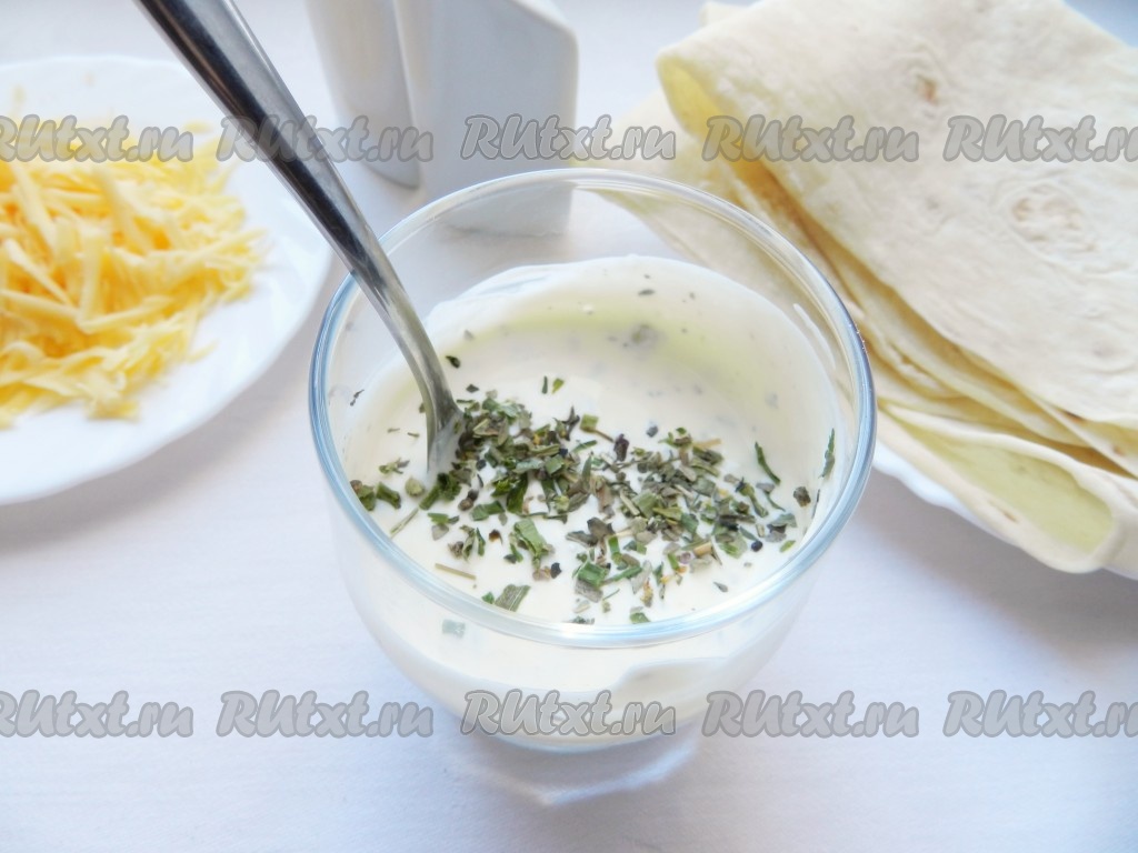 Лист лаваша (на фото половина) разложить на противне, смазать сметаной, посыпать сыром.
