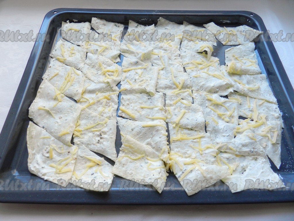 Разрезать лаваш на небольшие ромбики или треугольники. Удобно это сделать ножницами. Поставить противень в разогретую до 180 градусов духовку на 8-10 минут. Следите, чтобы чипсы не подгорели!