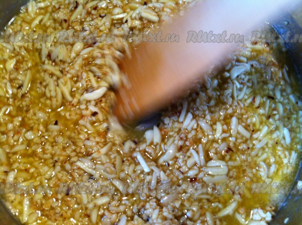 Как только масло начнёт закипать, всыпать орехи, перемешать и убрать с конфорки.