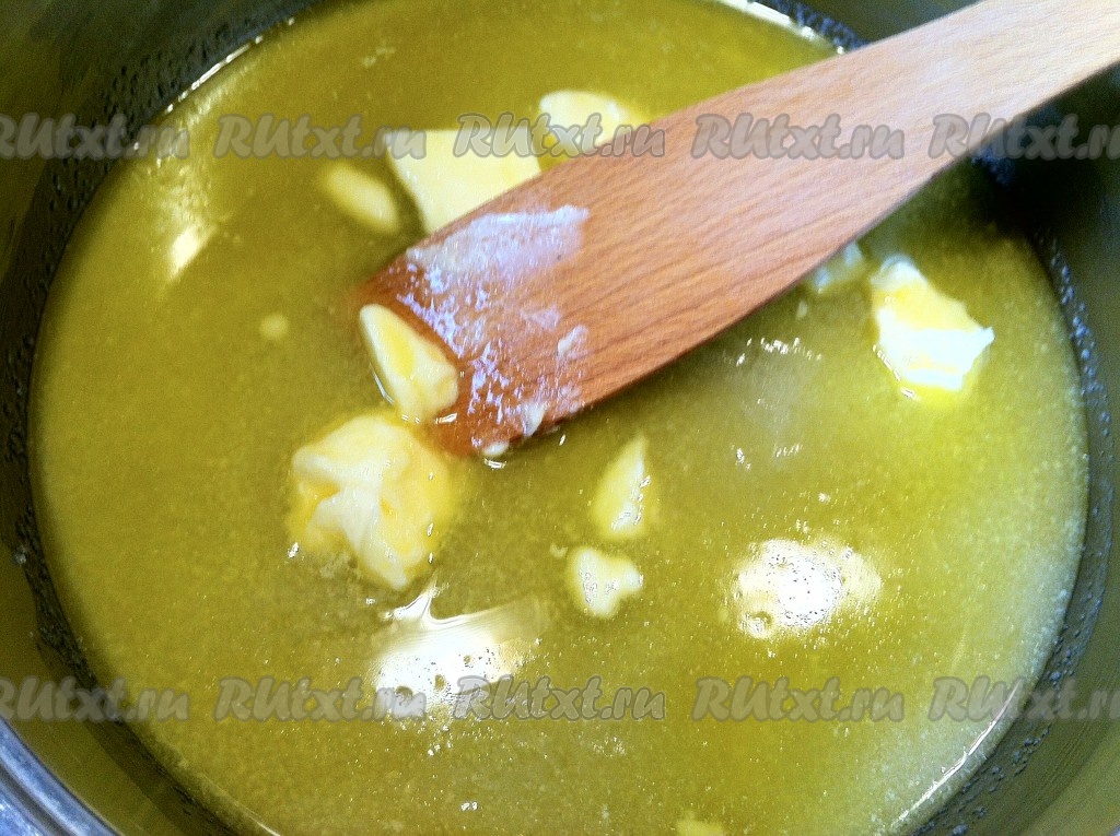 За это время приготовить заливку. В небольшой кастрюльке или ковшике растопить на среднем огне сливочное масло и сахар.