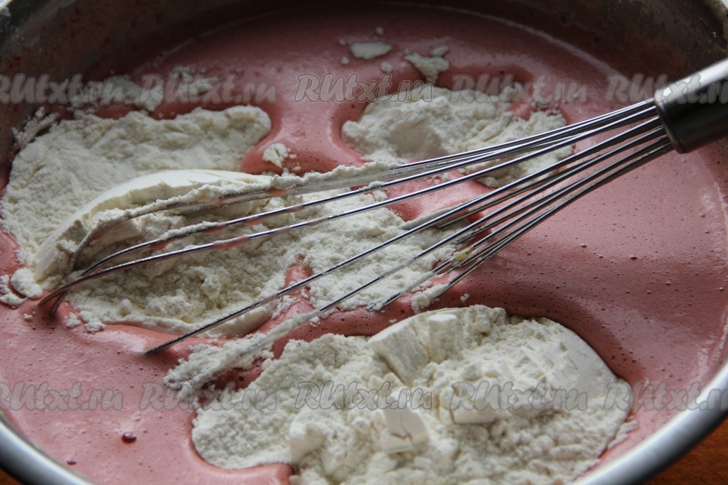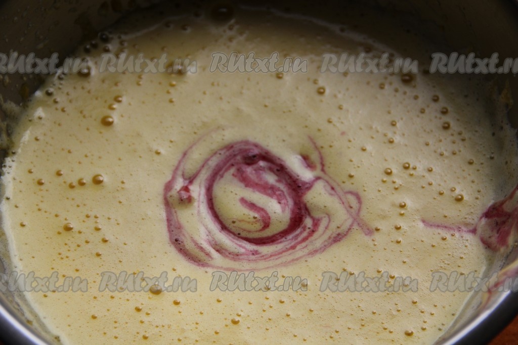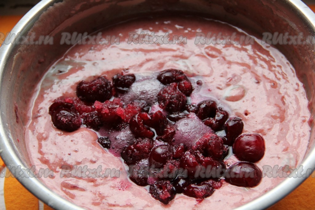 К яичной массе добавляем вишнёвое пюре, не прекращая взбивать медленно миксером.