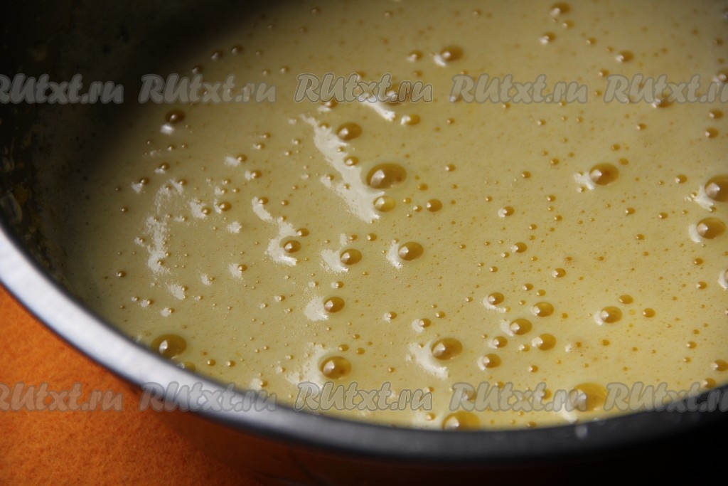 Вливаем растительное масло, следом высыпаем муку и разрыхлитель, хорошо перемешиваем.