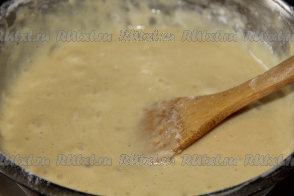 Яйца взбиваем с сахаром до полного его растворения, добавляем растительное масло, разрыхлитель и муку. Выливаем тесто в форму для выпекания.