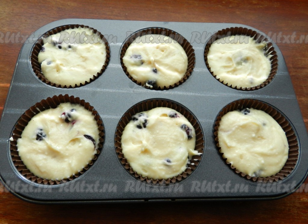 Готовое тесто разложить по формочкам для выпечки и поставить маффины с ягодами в нагретую до 180 градусов духовку на 25 минут.