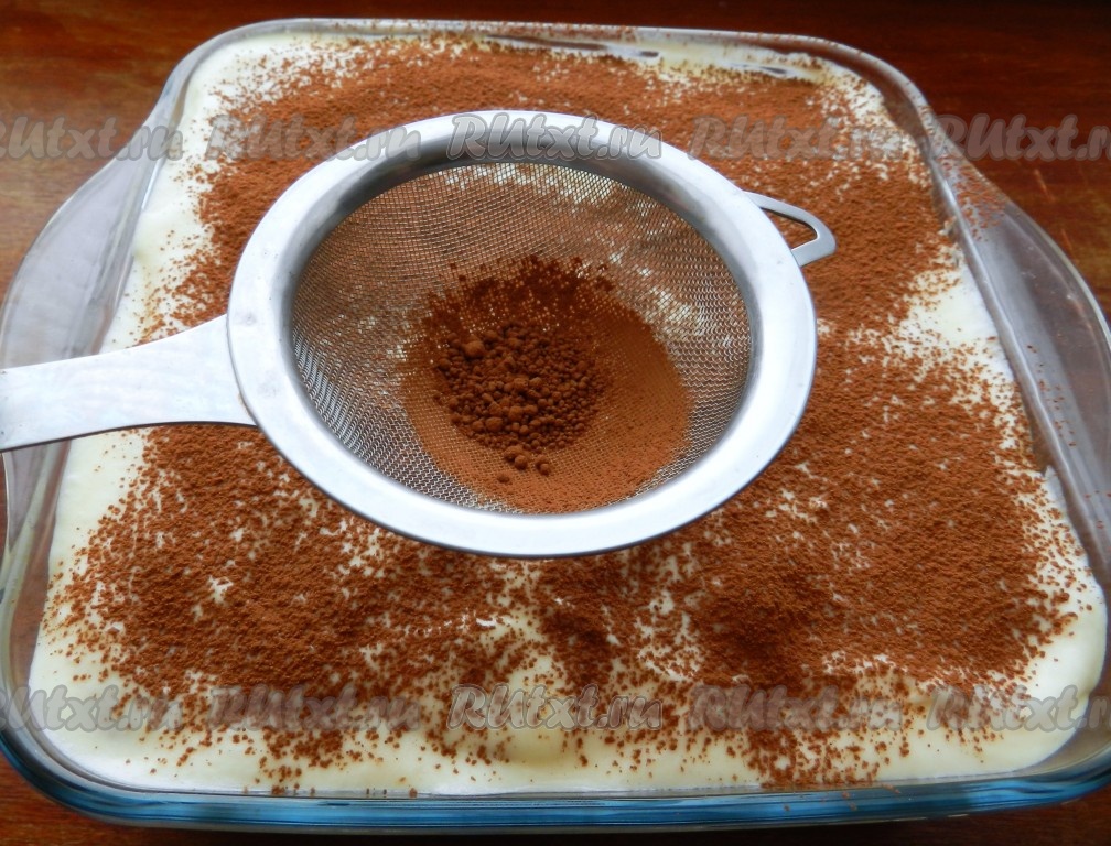 Через сито посыпать тирамису порошком какао. Форму с десертом накрыть пищевой пленкой или фольгой и убрать в холодильник на 4-5 часов или на ночь.