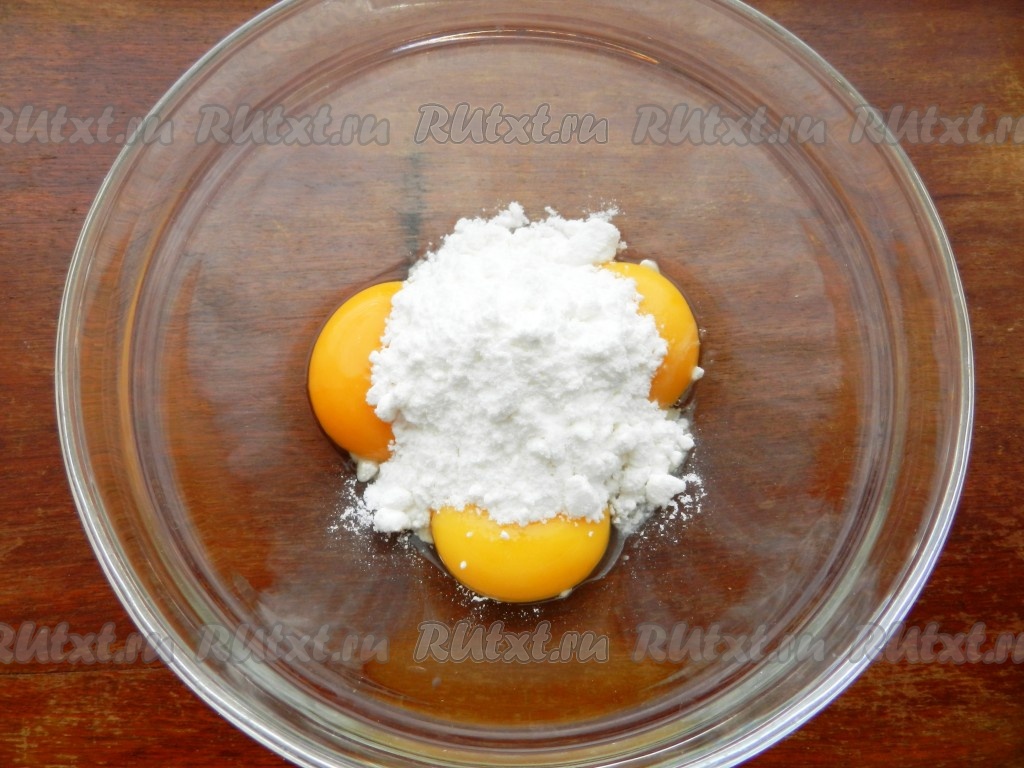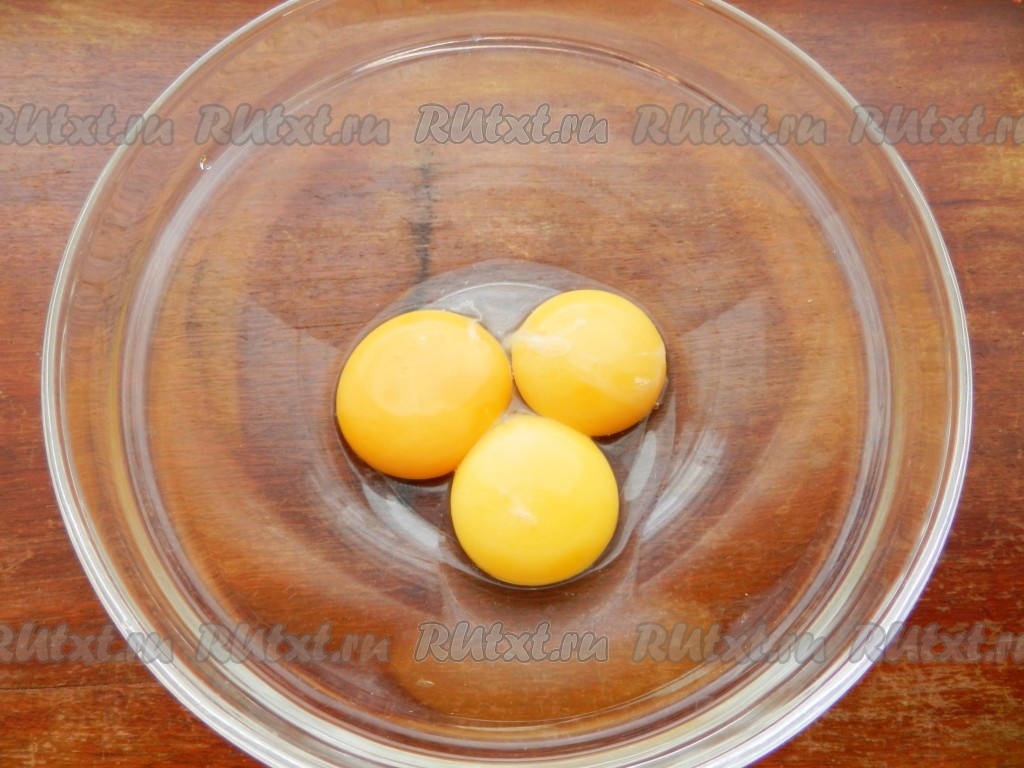Яйца разделить на желтки и белки. Белки убрать в холодильник.