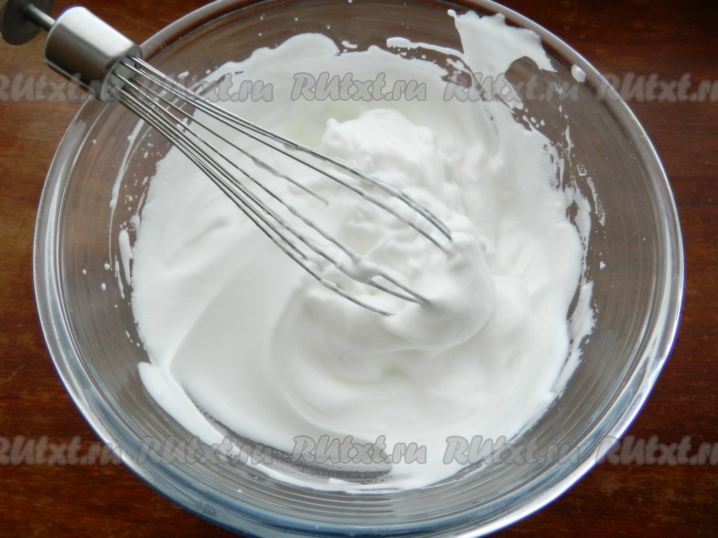 Охлажденные белки взбить в густую пену с оставшейся сахарной пудрой.