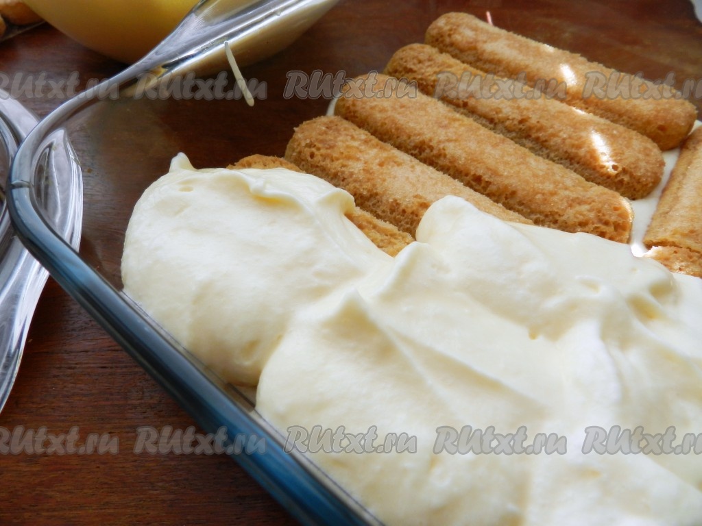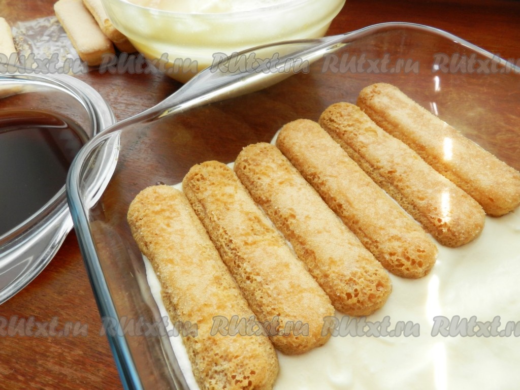 Поверх печенья выложить слой крема. Затем еще один слой печенья, смоченного в кофе, и еще один слой крема.